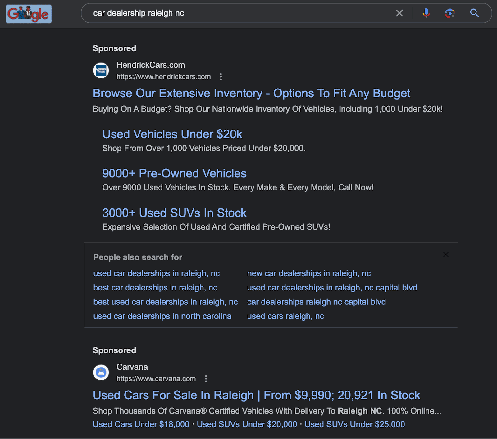 The search was for a Honda dealership. Hendrick Cars does sell this brand, but it also sells many others. It has chosen to focus on other benefits in its ad—a huge inventory, financing, and cars under $20K.