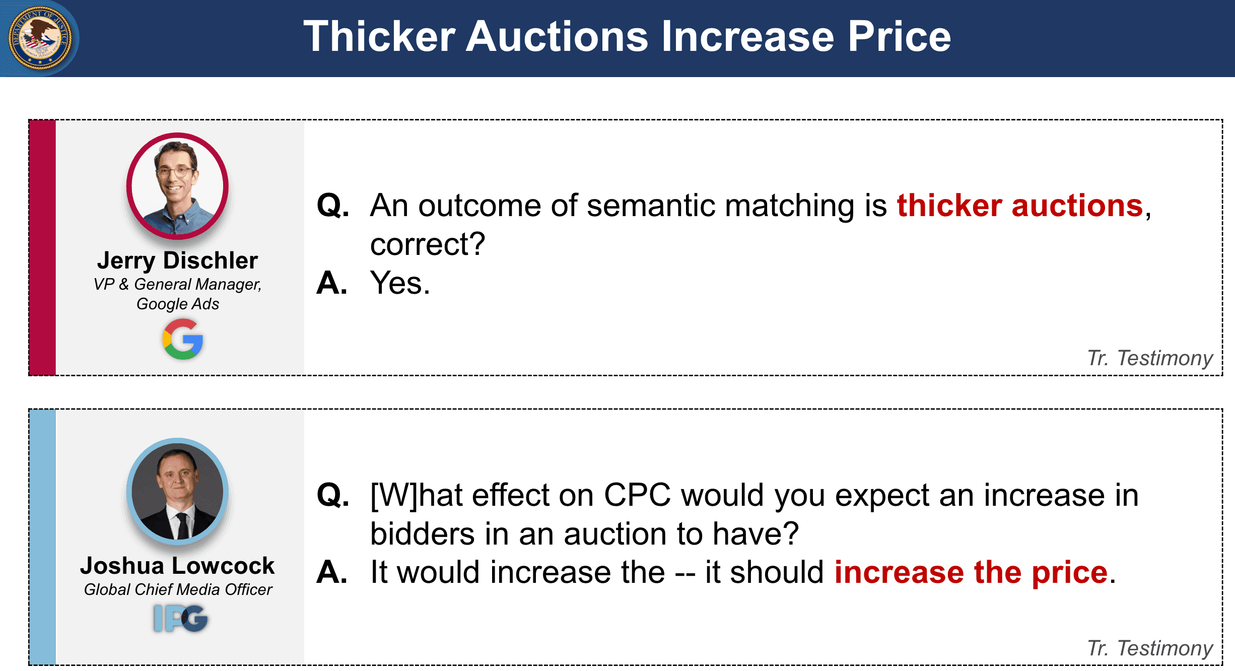 Whilst we’re not suggesting that automated campaigns perform worse (machine learning is after all far more powerful than even the best marketer) we do think that the trial vs. the US Government highlighted some very concerning justifications for pushing more broad-match campaigns, as it seems that a major factor is to increase the competitiveness of ad auctions overall.